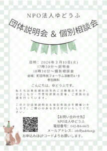 3月10日(火)団体説明会&個別相談会を行います(NPO法人ゆどうふ)