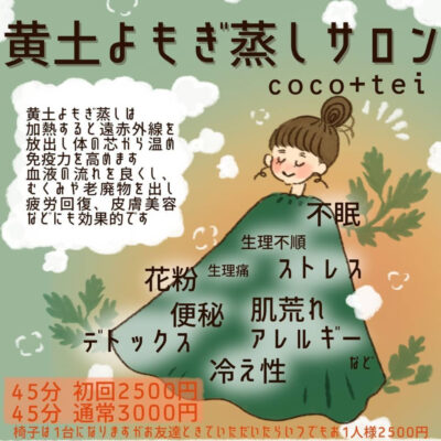 初めまして。黄土よもぎ蒸しサロン coco+tei(ココトテイ)です。