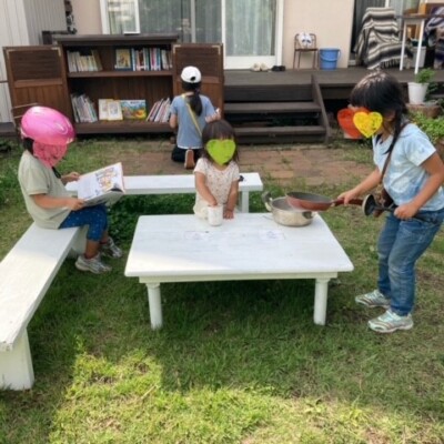 地域の居場所として、お庭を開放しています。草花やお水を使っておままごと遊びをする親子さんもいるようです。